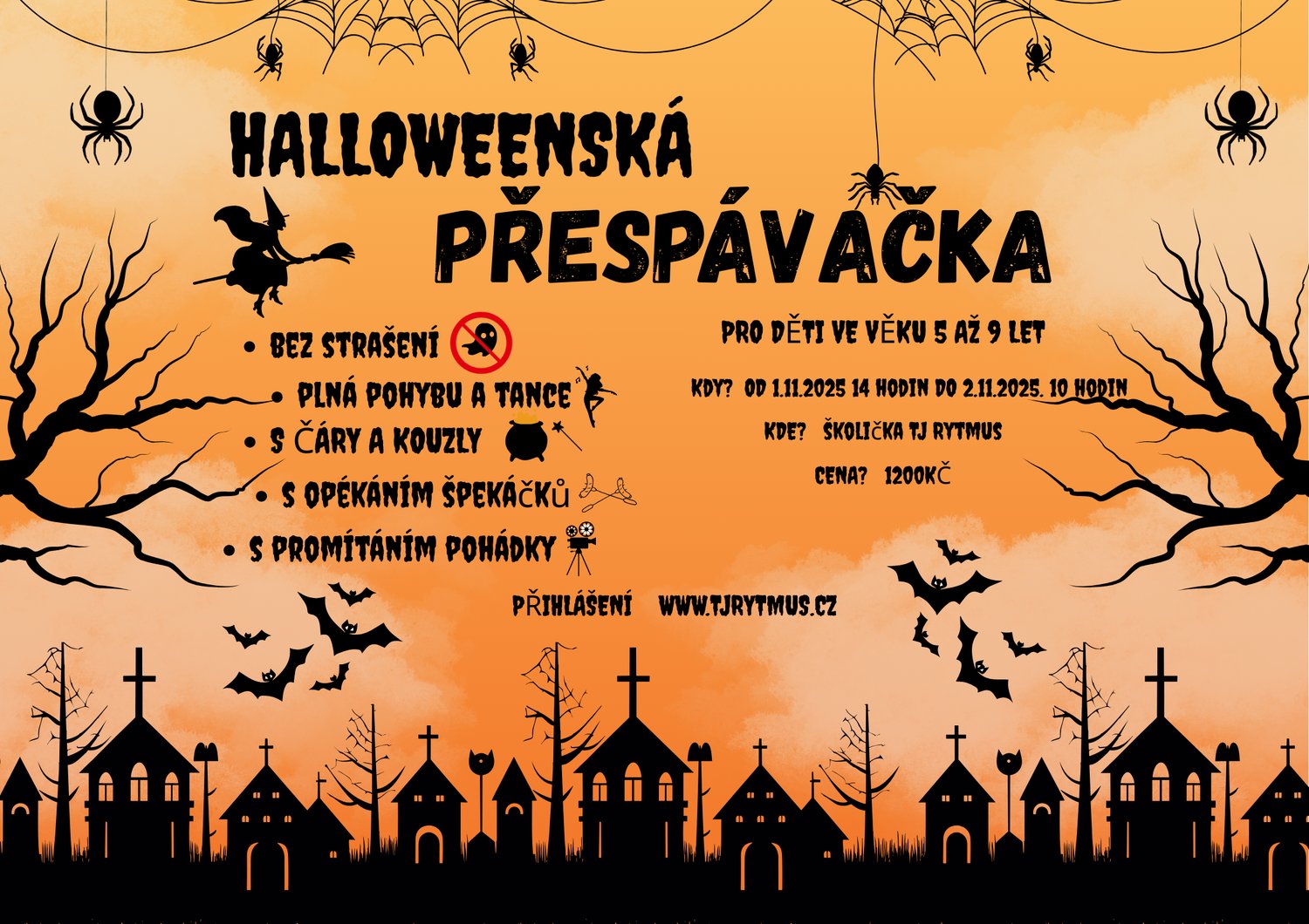 A je to tady!!! Co? No přece HALLOWEENSKÁ PŘESPÁVAČKA!!! Užijeme si prima odpoledne a večer plný pohybu a tance s čáry a kouzly, opékáním špekáčků a před usnutím promítáním pohádky Coco. Čeká nás spousta zábavy!