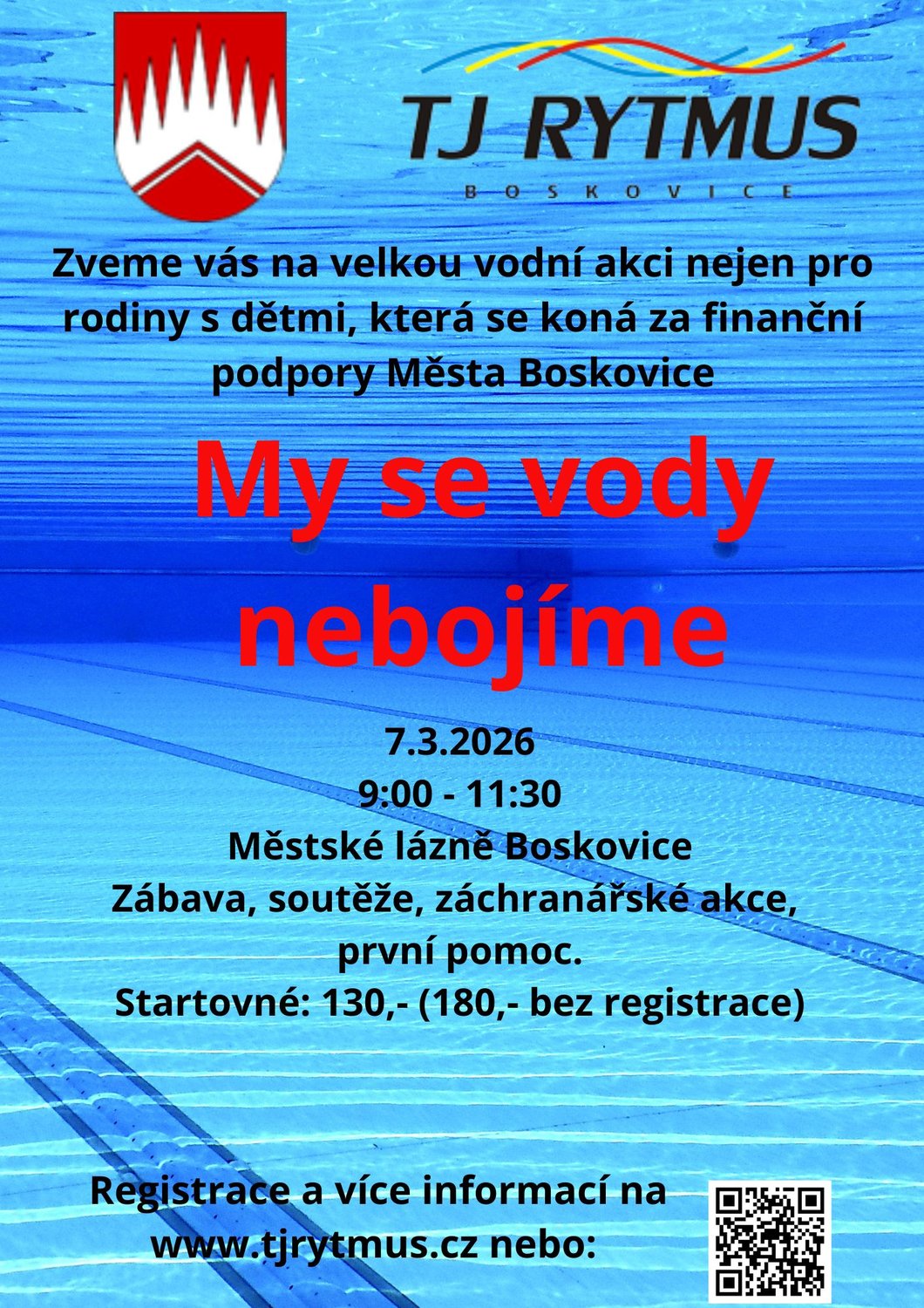 Chceme vás pozvat na sobotní akci, která je určena rodinám s dětmi, ale i všem ostatním. Přijďte si zaplavat, zasoutěžit, zasportovat. Akce je organizovaná za finanční podpory Města Boskovice. Akce je vhodná pro děti od jednoho roku.